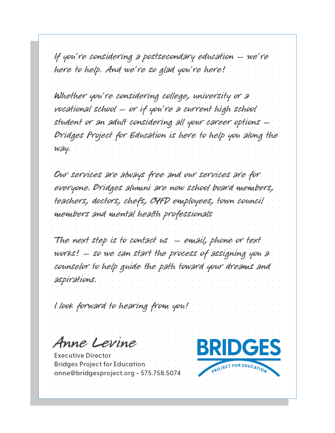 Each year we see approximately $100K in regional and local scholarships awarded to Bridges clients and upwards of $200-400K in institutional aid from their respective colleges and vocational programs.